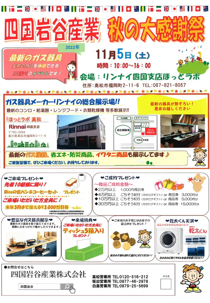 • 2022年11月5日(土)高松支店 秋の大感謝祭inリンナイ四国支店ほっとラボ 2022/10/31